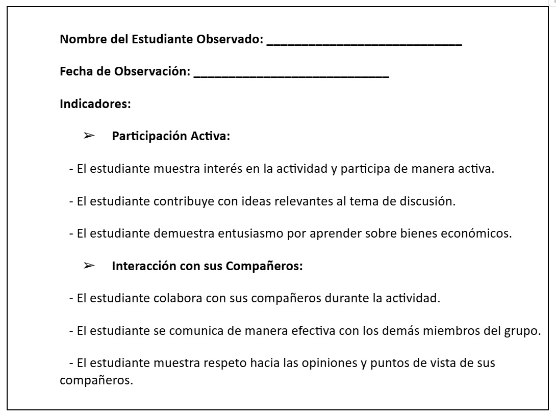 Este instrumento de evaluación por observación proporciona una estructura para registrar el desempeño de los estudiantes durante la actividad sobre bienes económicos. Al centrarse en indicadores específicos, permite evaluar diferentes aspectos del aprendizaje de los estudiantes y proporcionar retroalimentación detallada sobre su participación y comprensión del tema.