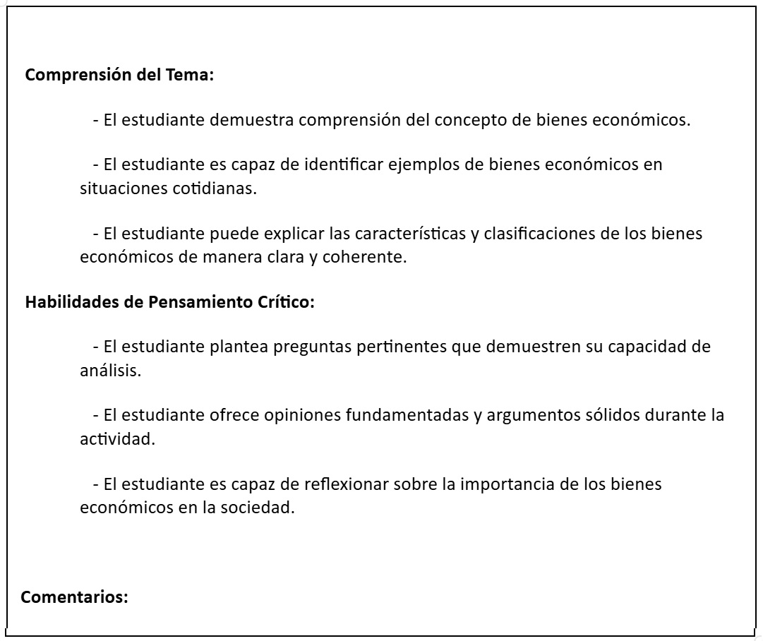 En el contexto de esta secuencia didáctica sobre bienes económicos, la evaluación se concibe como una herramienta para medir no solo el conocimiento conceptual, sino también las habilidades de análisis, pensamiento crítico y aplicación práctica de los conceptos económicos en situaciones concretas. Mediante una evaluación formativa y auténtica, se busca proporcionar retroalimentación significativa que guíe y enriquezca el proceso de aprendizaje de los estudiantes, permitiéndoles desarrollar una comprensión profunda y aplicable de los temas abordados.